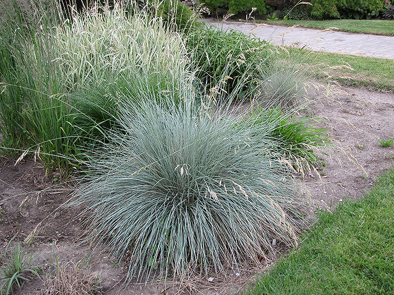Tidy mounds of ornamental grass features arching, narrow steel-blue foliage; drought tolerant and easy to grow, perfect for beds, borders and rock gardens; straw colored plumes emerge during the summer months