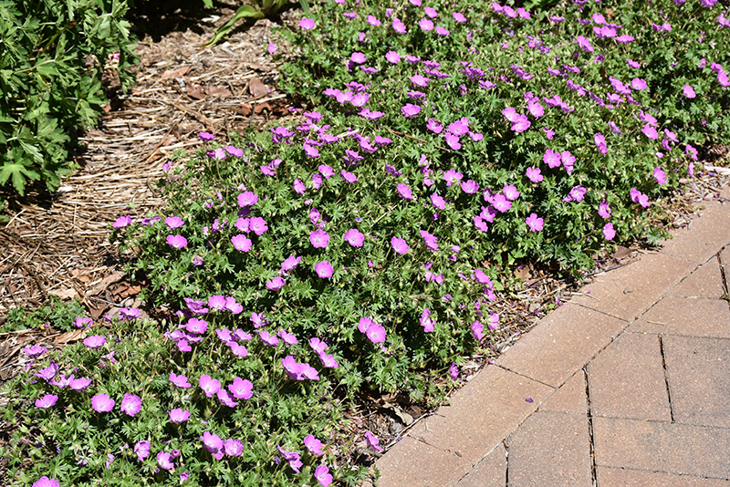 Large, fuchsia colored, saucer-shaped flowers cover mounds of deep green, finely cut leaves during the early summer months; foliage turns a stunning red during the cooler autumn months; compact form, great for beds, borders and cottage gardens