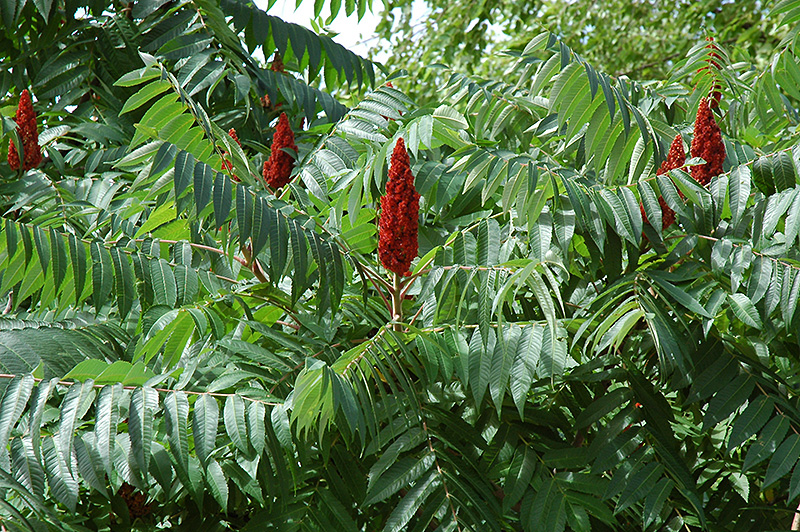 Staghorn Sumac is primarily grown for its highly ornamental fruit. The crimson fruits are carried on showy plumes displayed in abundance from late summer to late winter. It has spikes of yellow flowers rising above the foliage from early to mid summer. It has green deciduous foliage. The large narrow pinnately compound leaves turn an outstanding scarlet in the fall.