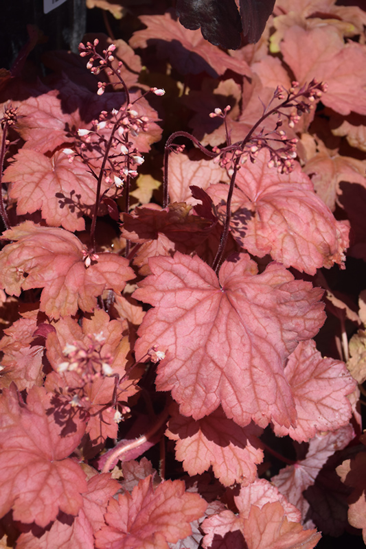 Georgia Peach Coral Bells will grow to be about 12 inches tall at maturity extending to 18 inches tall with the flowers, with a spread of 18 inches. When grown in masses or used as a bedding plant, individual plants should be spaced approximately 15 inches apart. Its foliage tends to remain dense right to the ground, not requiring facer plants in front. It grows at a medium rate, and under ideal conditions can be expected to live for approximately 10 years. As an evegreen perennial, this plant will typically keep its form and foliage year-round.